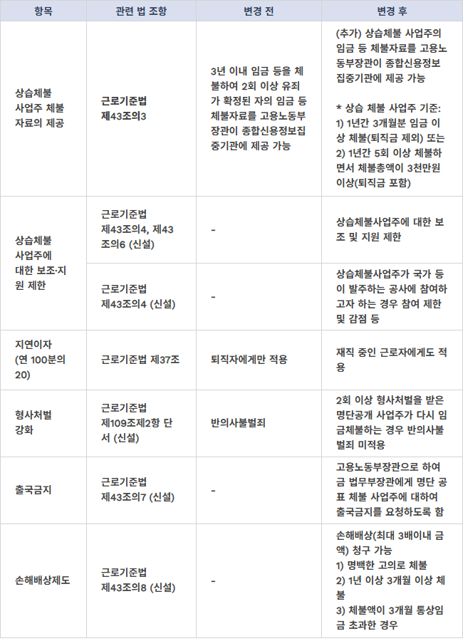 형사적 제재로는 ▲ 상습 체불 사업주에 대한 반의사불벌죄를 미적용과 해당 사업주는 출국금지 조치가 가능하고, ▲ 사업주에 대한 처벌 최고 수위가 징역 3년에서 5년 이하로 강화되고, ▲ 3년 이내 한 번의 체불로 인한 확정판결만으로도 사업주 명단 공개가 가능한 내용이 추가되었습니다.