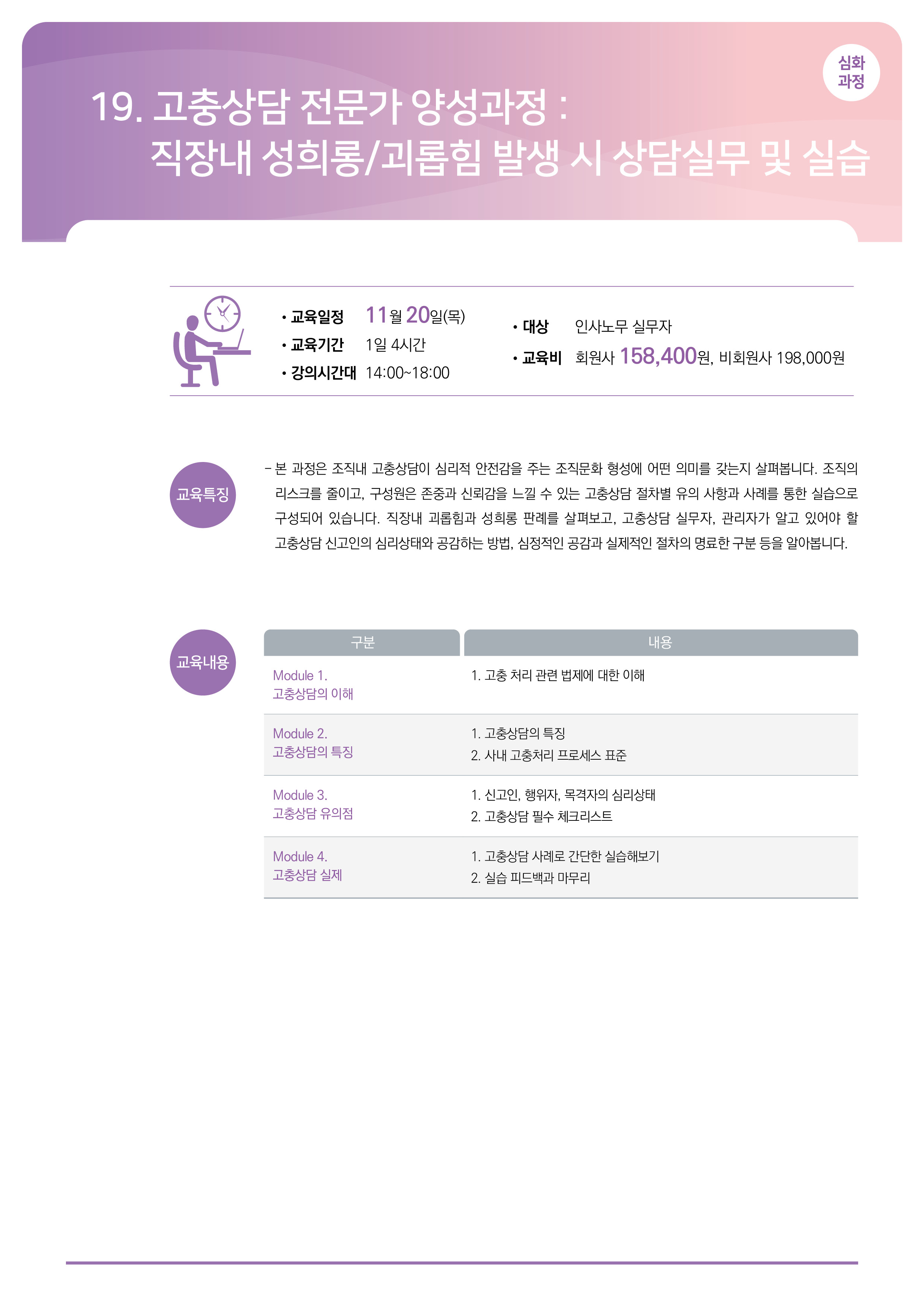 [11/20 신청가능] 고충상담 전문가 양성과정: 직장내 성희롱/괴롭힘 발생 시 상담실무 및 실습