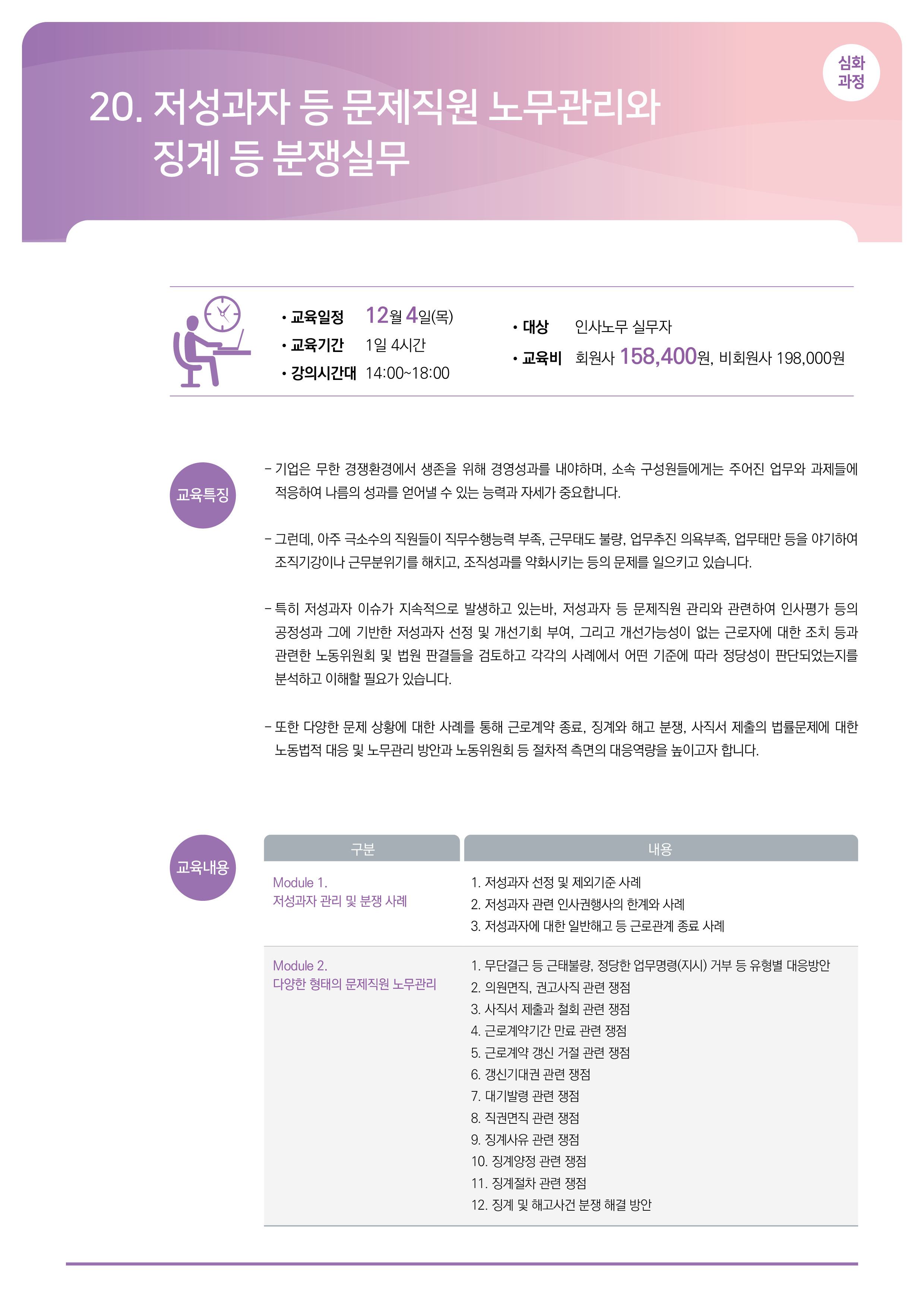 [12/04 신청종료] 저성과자 등 문제직원 노무관리와 징계 등 분쟁실무