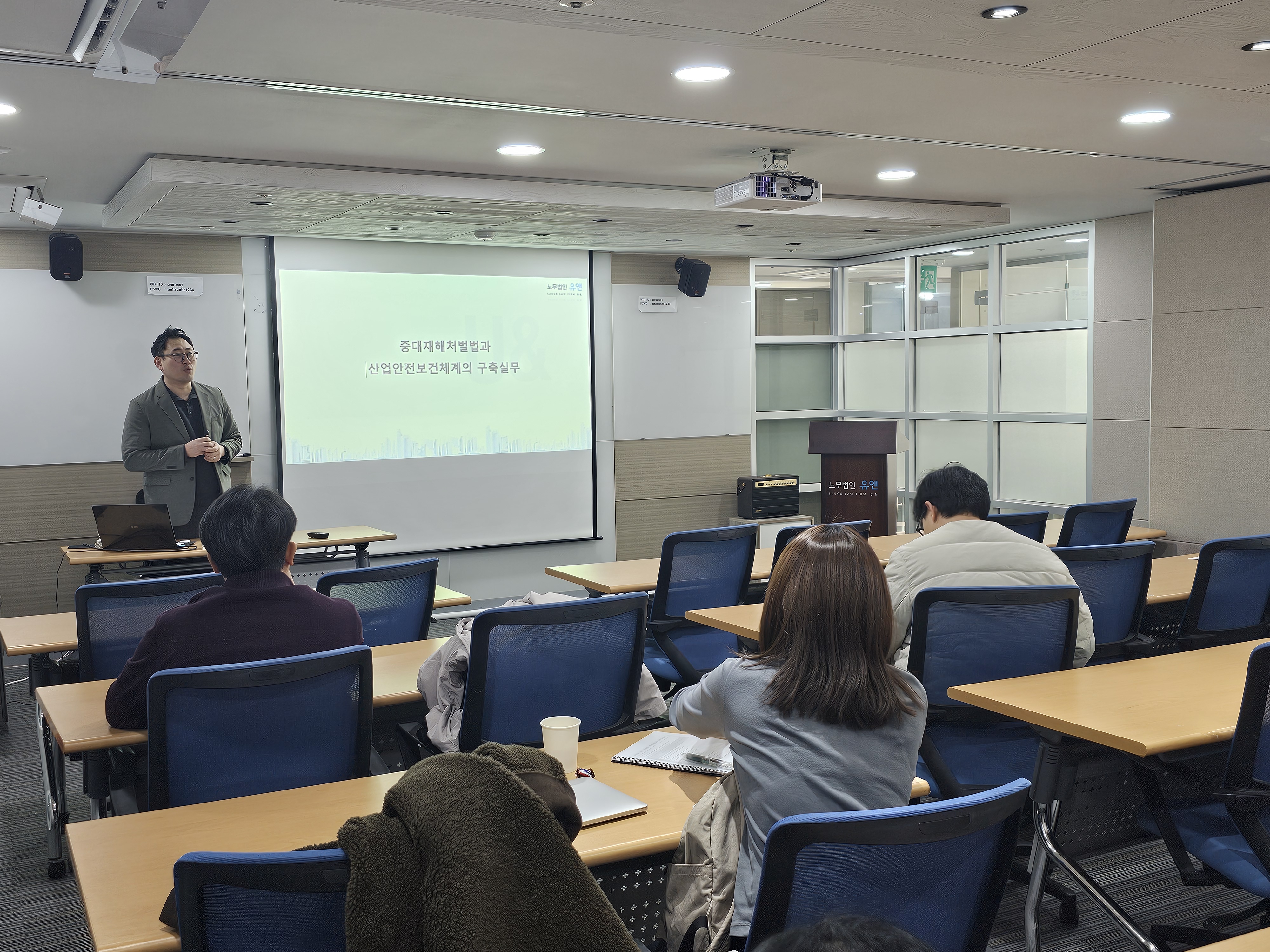 노무법인 유앤은 2026.01.27.(화) 「중대재해처벌법과 산업안전보건체계의 구축 실무」 (강사, 신홍교 노무사)을 주제로 인사노무 담당자 역량향상 교육을 실시하였습니다.