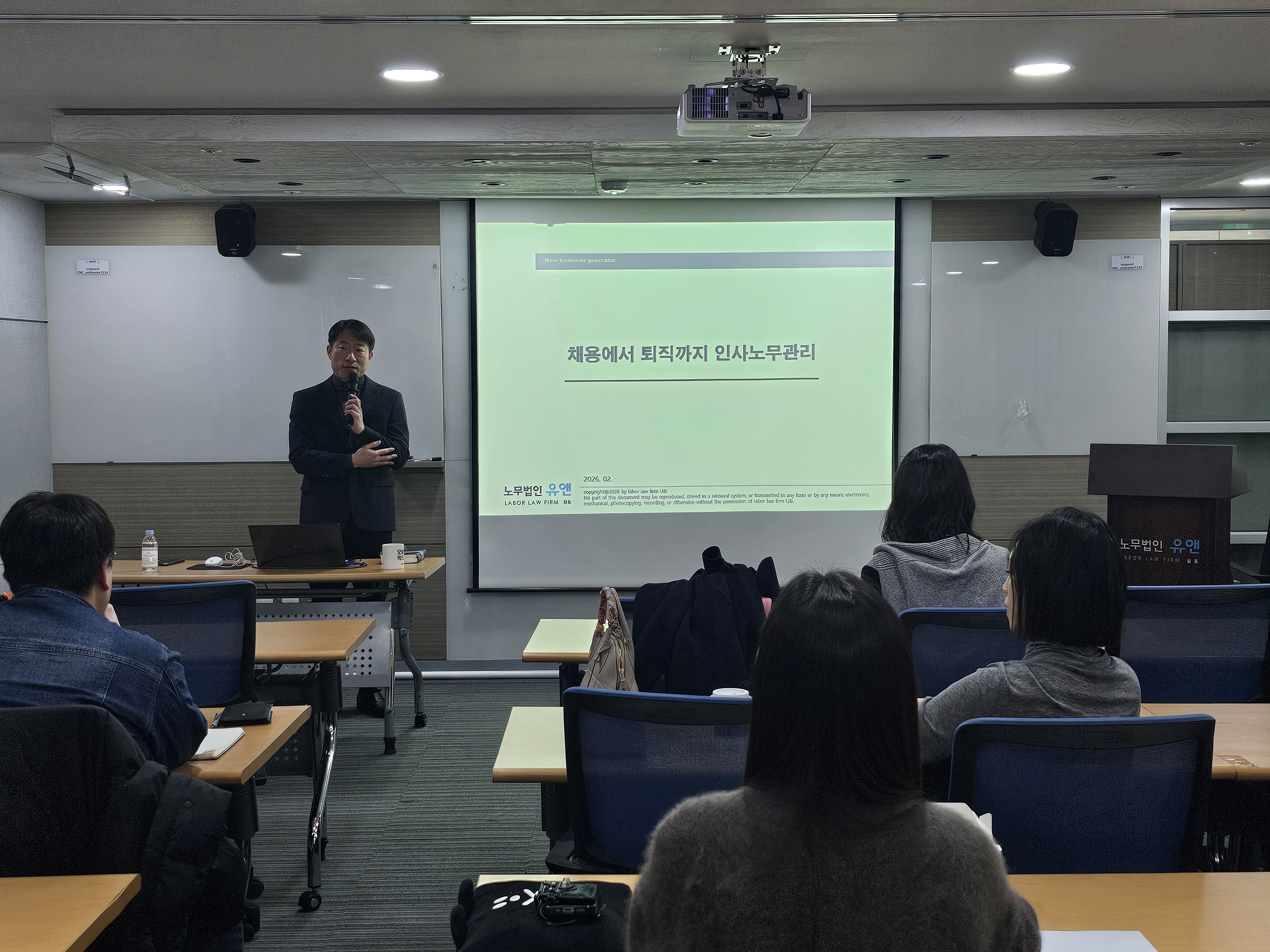 노무법인 유앤은 2026.02.05.(목) 「인사노무 담당자를 위한 채용에서 퇴직까지 핵심노무관리」 (강사, 오영배 노무사)을 주제로 인사노무 담당자 역량향상 교육을 실시하였습니다.