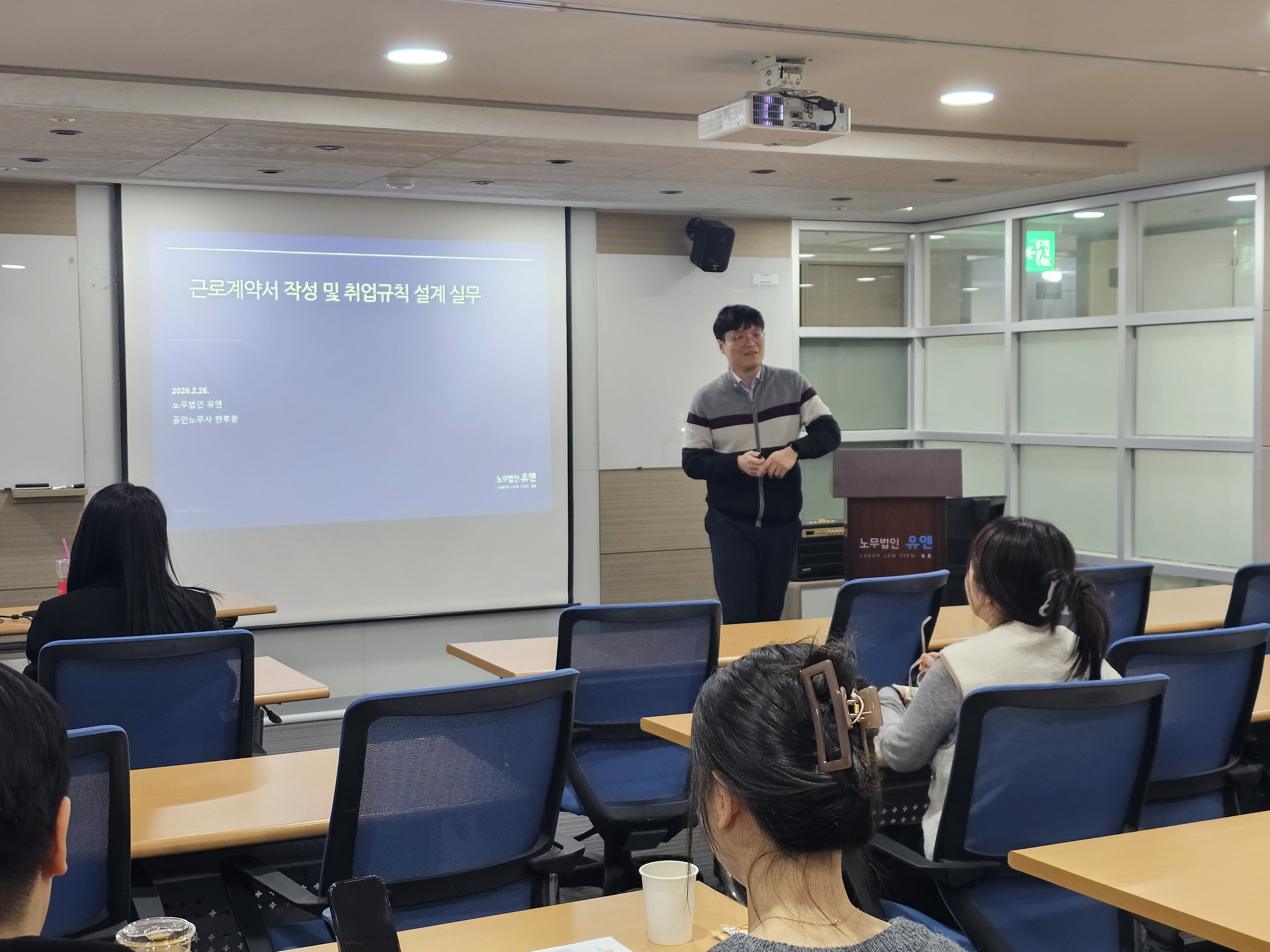 노무법인 유앤은 2026.02.26.(목) 「근로계약서 작성 및 취업규칙 설계 실무」 (강사, 한후광 노무사)을 주제로 인사노무 담당자 역량향상 교육을 실시하였습니다.
