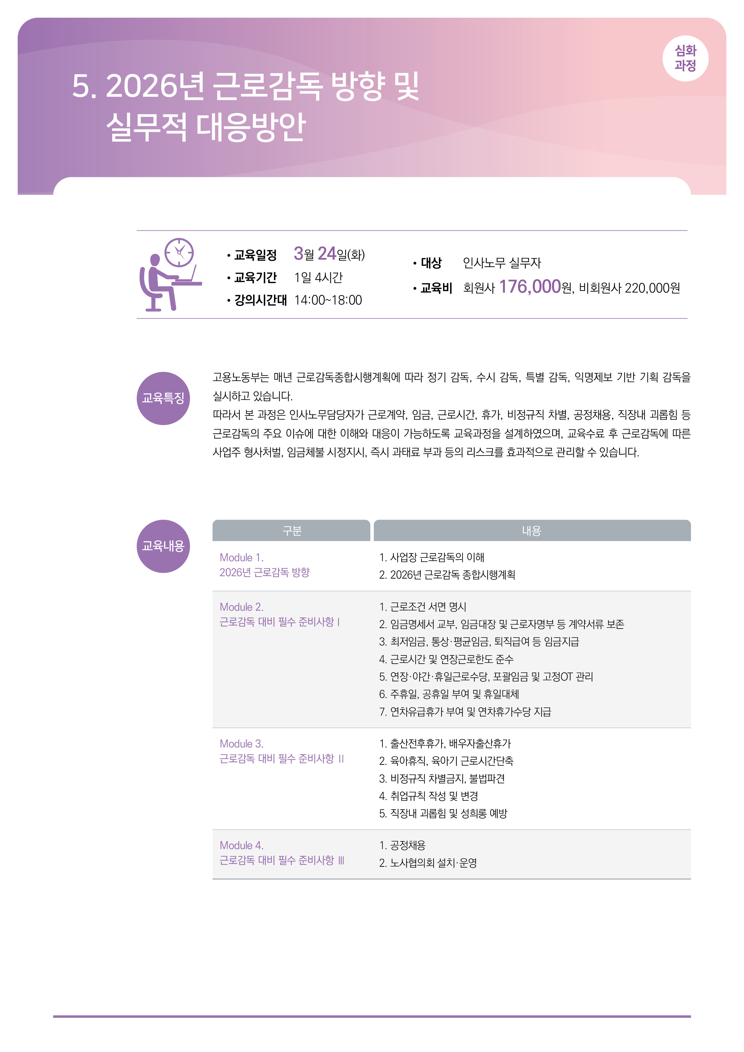 임금 및 4대보험 전문가과정,  대학 직원의 인사노무관리, 중소기업 인사노무관리 리스크 완전정복, 사회복지시설 인사노무관리,