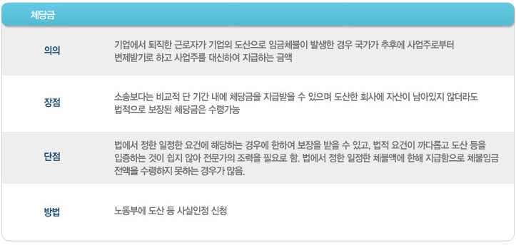 도산/파산으로 기업이 폐업하게 될 경우 근로자는 임금/퇴직금 등을 받을 수 없게 됨.임금을 받지 못한 근로자를 위해 체불임금 중 일부를 정부에서 대신 지급하는 제도 (3개월간 임금, 3년간 퇴직금 지급, 연령별 상한액 있음)